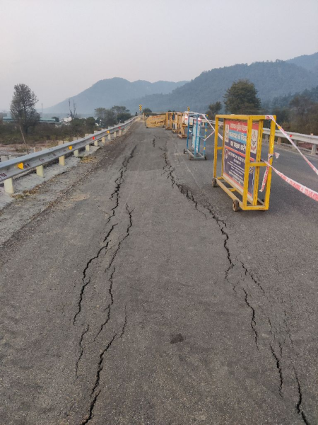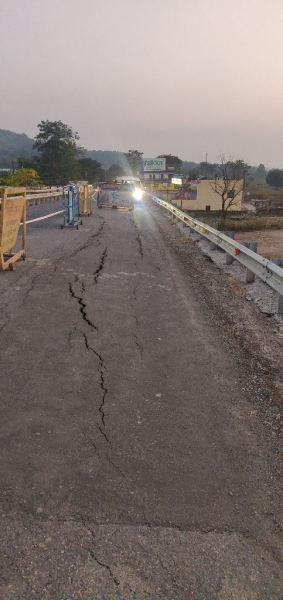 "Depression and sinking in approximately 28 m length and in 3m maximum width is observed in Thano side aproach road. 2. Deflection in RCC retaining wall is observed due to which 3 cm wide crack observed in 1.45 m length in left side. Reccommendation: Retrofitting and repair is needed after taking expert opinion "