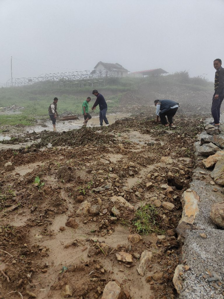 Landmark: Construction of helipad in dhanolty aluchak farm Remark: Aluchak farm dhanolty मेँ दलदली मिट्टी होने से कार्य करने मेँ बाधा हों रहें है एवम मेटीरियल आने मेँ ट्रक मिट्टी मेँ धंस रहें है , लगातार बरसात से कार्या मेँ बाधा उत्पन हों रही है